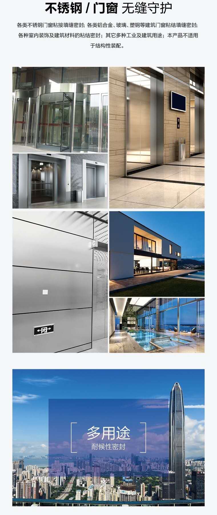使用范圍:各類高端門窗、重型移門、鋁門窗、塑鋼門窗安裝填縫密封;玻璃、瓷磚、混凝土、石材填縫密封;室內外裝修粘接密封;其它多種用途。