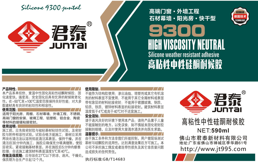 產品特性:本產品系單組份、室溫中性固化高粘性硅酮耐候膠;固化速度快,強度高;完全固化后具有優異的耐候耐老化性,在-50℃至+100℃溫度范圍保持良好性能;對大多數建材具有良好的粘結性和相容性。