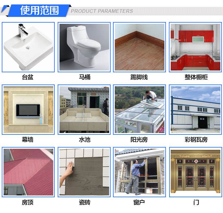 使用范圍:適用于中、小型明框幕墻、陽光房、遮雨棚、不銹鋼、外墻工程、高端門窗安裝、玻璃、石材、鋁塑板、鋁合金、金屬、陶瓷等材料的粘結密封。