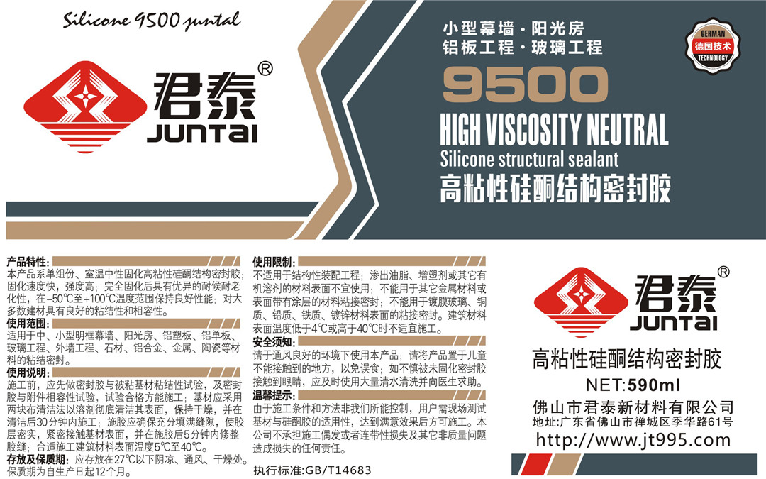 產品特性:本產品系單組份、室溫中性固化高粘性硅酮結構密封膠;固化速度快,強度高;完全固化后具有優異的耐候耐老化性,在-50℃至+100℃溫度范圍保持良好性能;對大多數建材具有良好的粘結性和相容性。